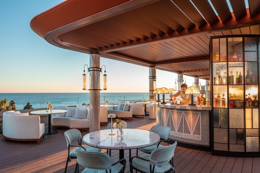 No vizinho SEEN Bar, os hóspedes são convidados a sentar-se no bar redondo ou a apreciar as vistas panorâmicas no terraço externo de dois andares e a apreciar as vistas que se estendem desde o Mar Mediterrâneo, à esquerda, até os encantadores telhados do centro histórico de Nice, as montanhas e além. O clima praiano é definido pela música com DJ ao vivo com coquetéis de primeira linha de mixologistas premiados e petiscos impecavelmente executados pelo Chef Olivier da Costa.