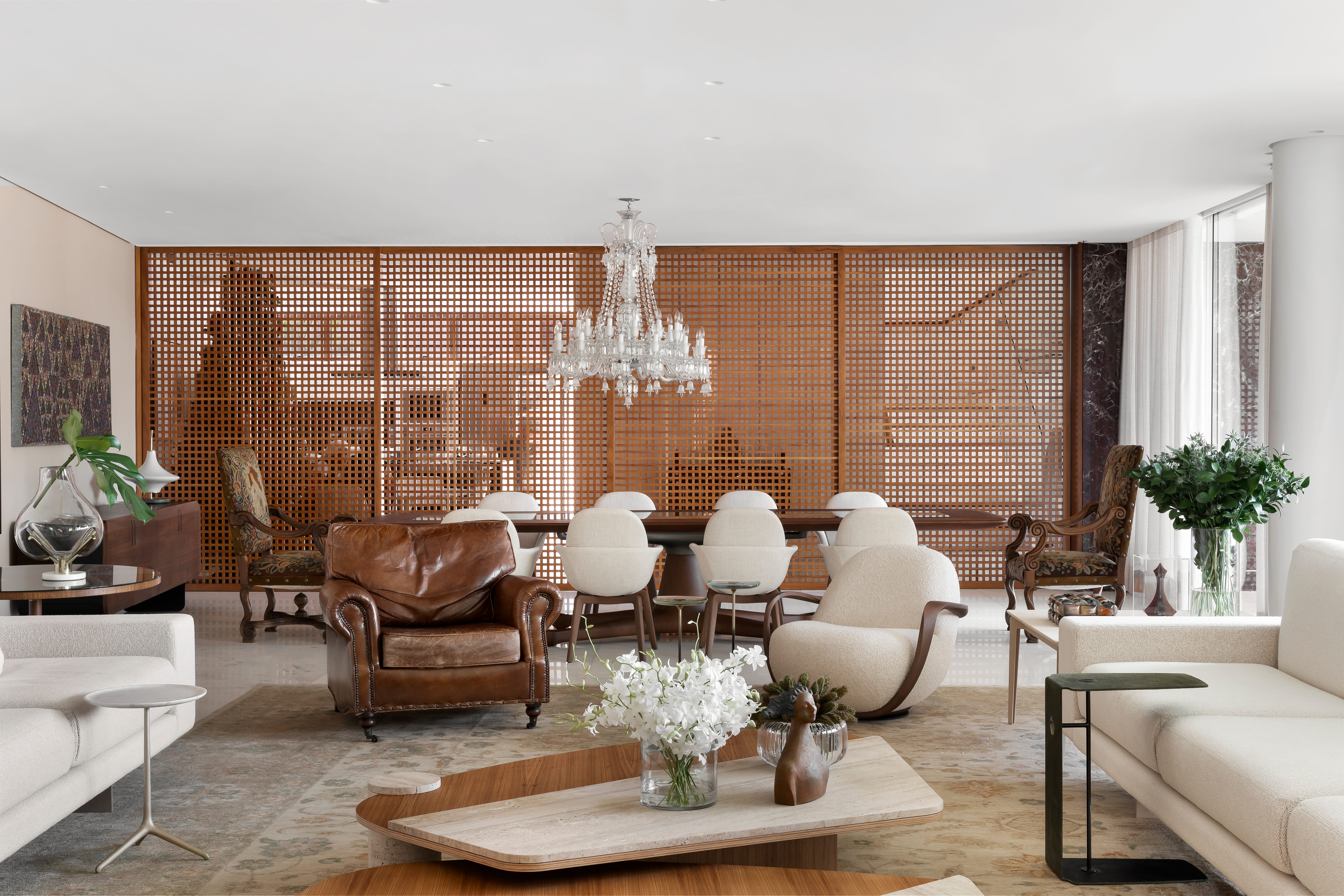 É esse arsenal de vida bem vivida que delineia e dá sentido à decoração, proporcionando uma atmosfera na qual é criada uma conexão entre os ambientes e quem vive ali. No projeto, a arquiteta mesclou mobiliário de design contemporâneo com peças clássicas do acervo dos clientes e outras garimpadas ao longo da vida.