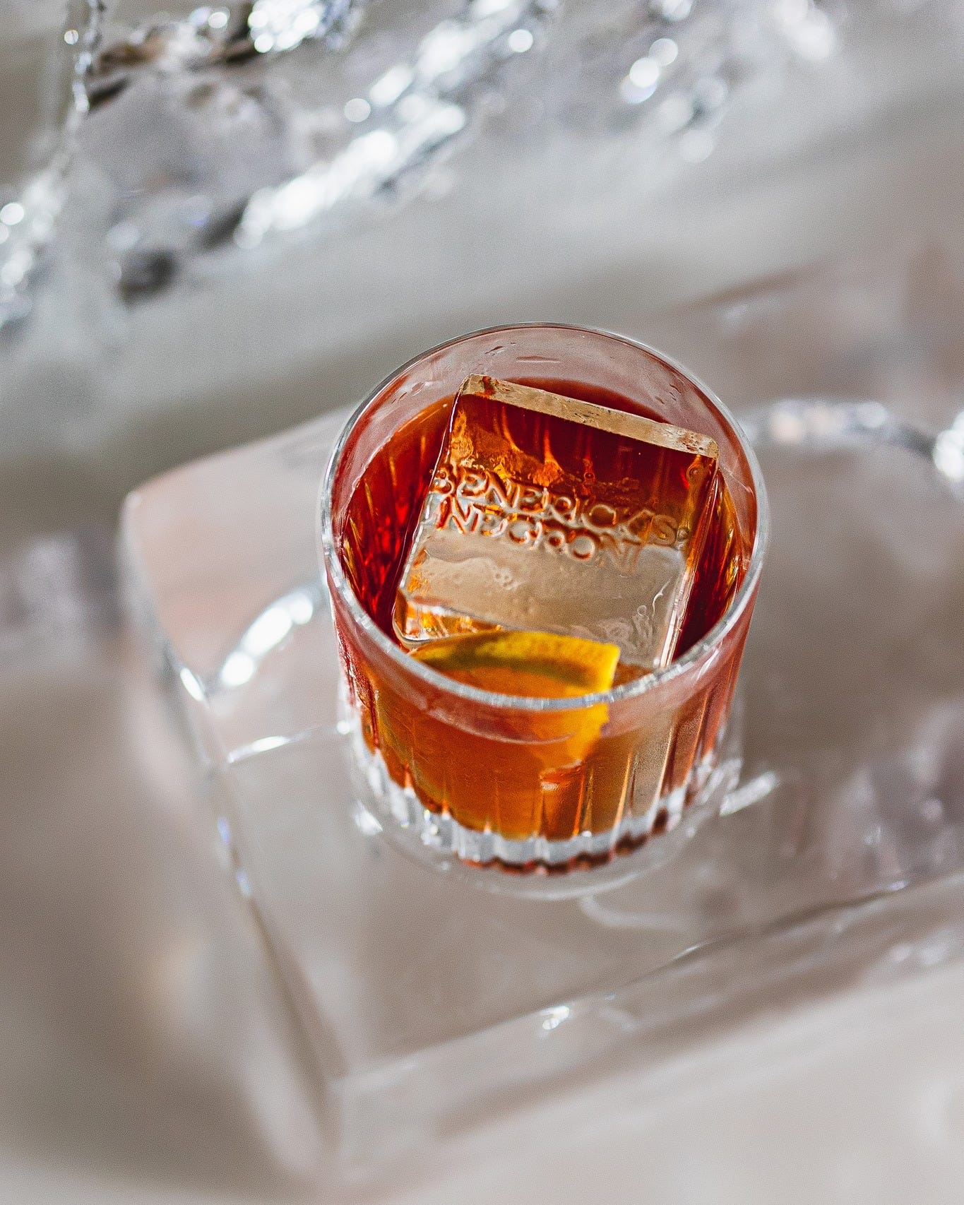 O Benerick's Negroni é um drink composto por gim, aperitivo de laranja e vermute, com um toque especial de brasilidade com bitter de laranja-baía e nibs de cacau orgânico.
