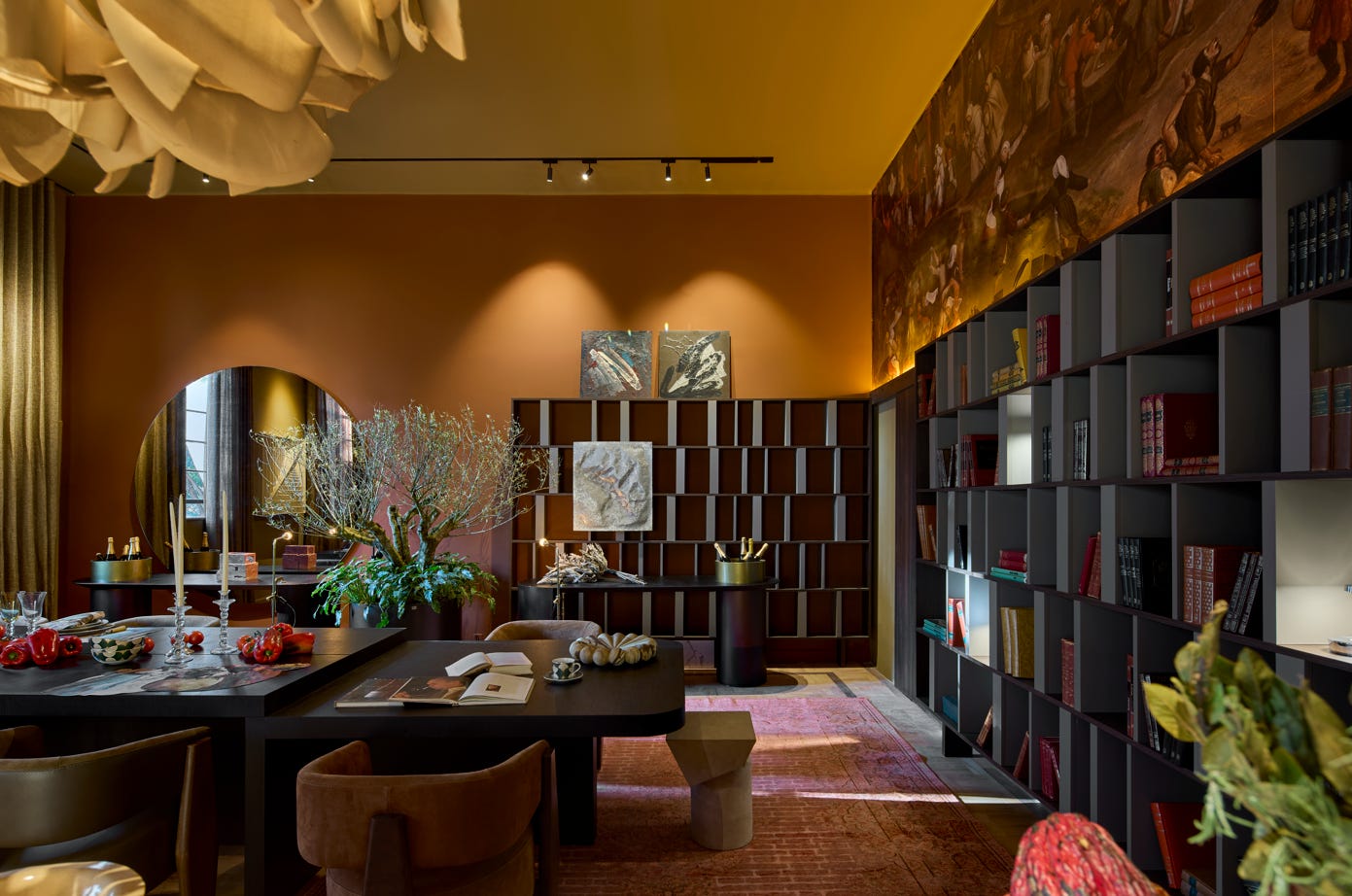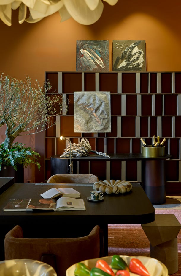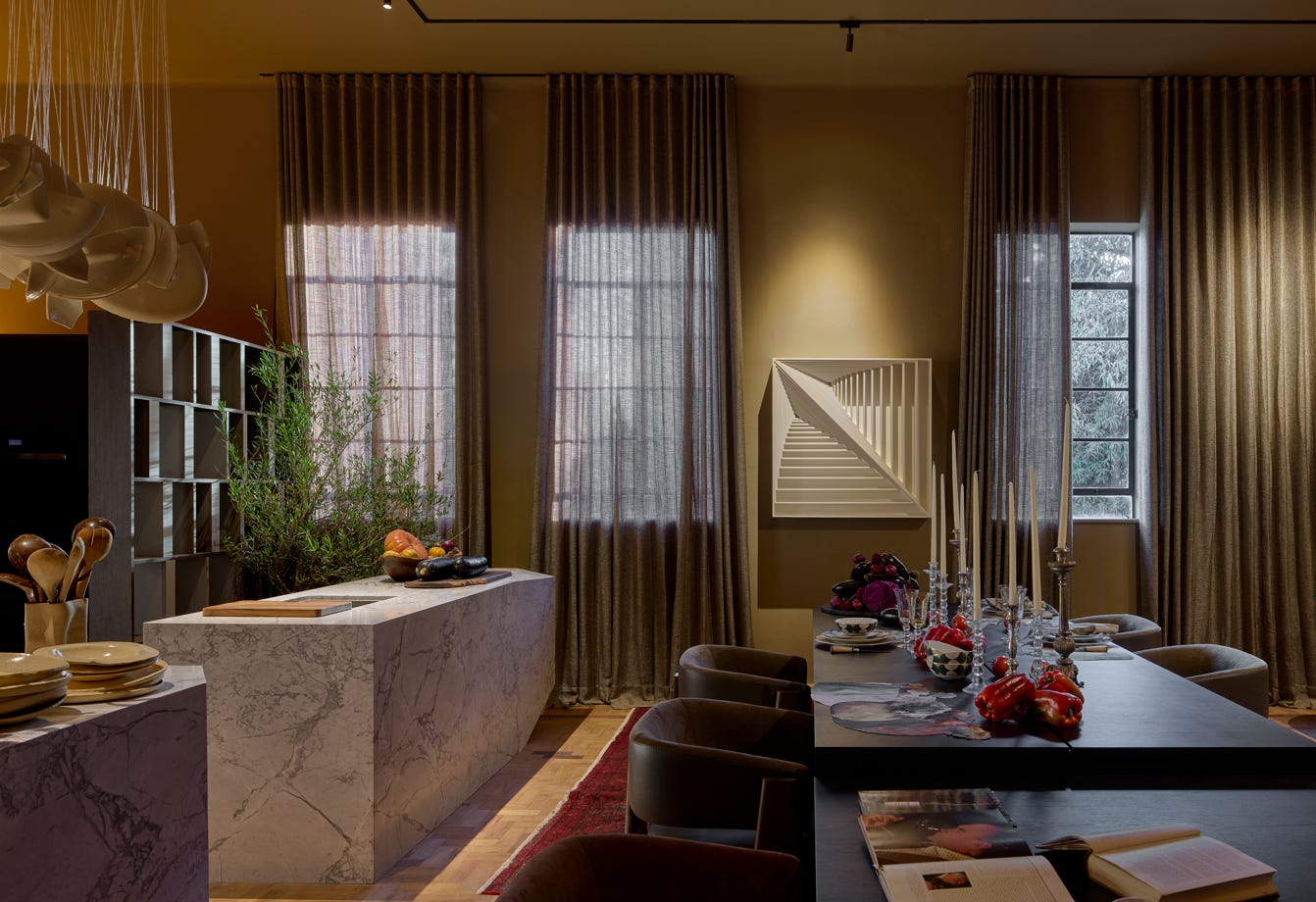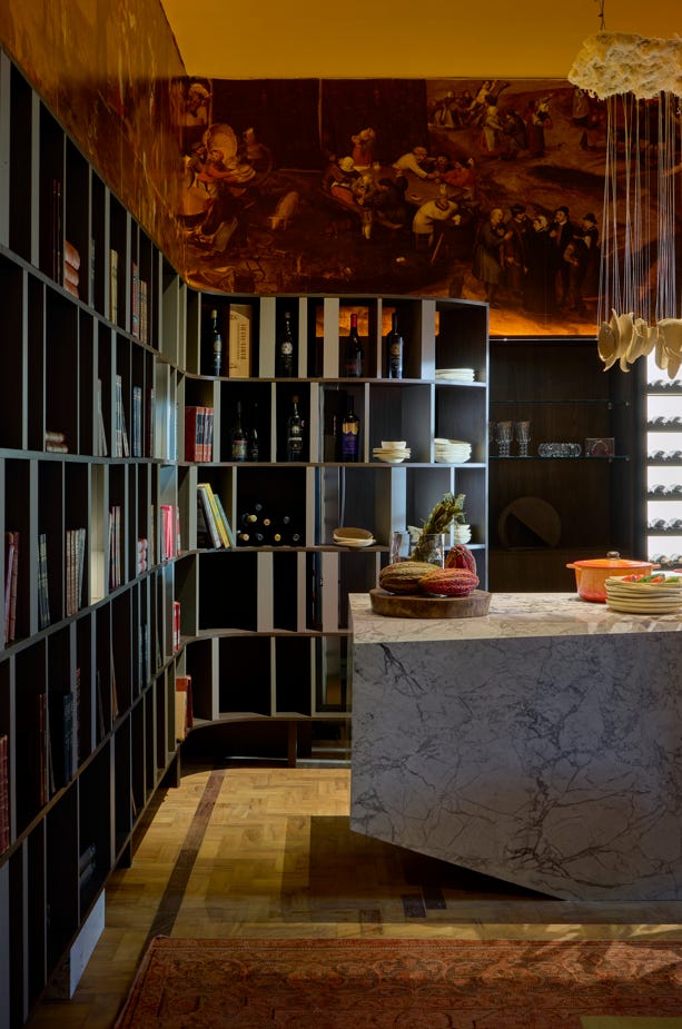 Um espaço de confraria intimista para momentos memoráveis. Nele, a paixão por vinhos se revela na vasta adega, e a atmosfera para degustá-los com calma é amplificada pelo painel que desconstrói digitalmente a obra Feira dos Camponeses (1570), de Peeter Baltens.