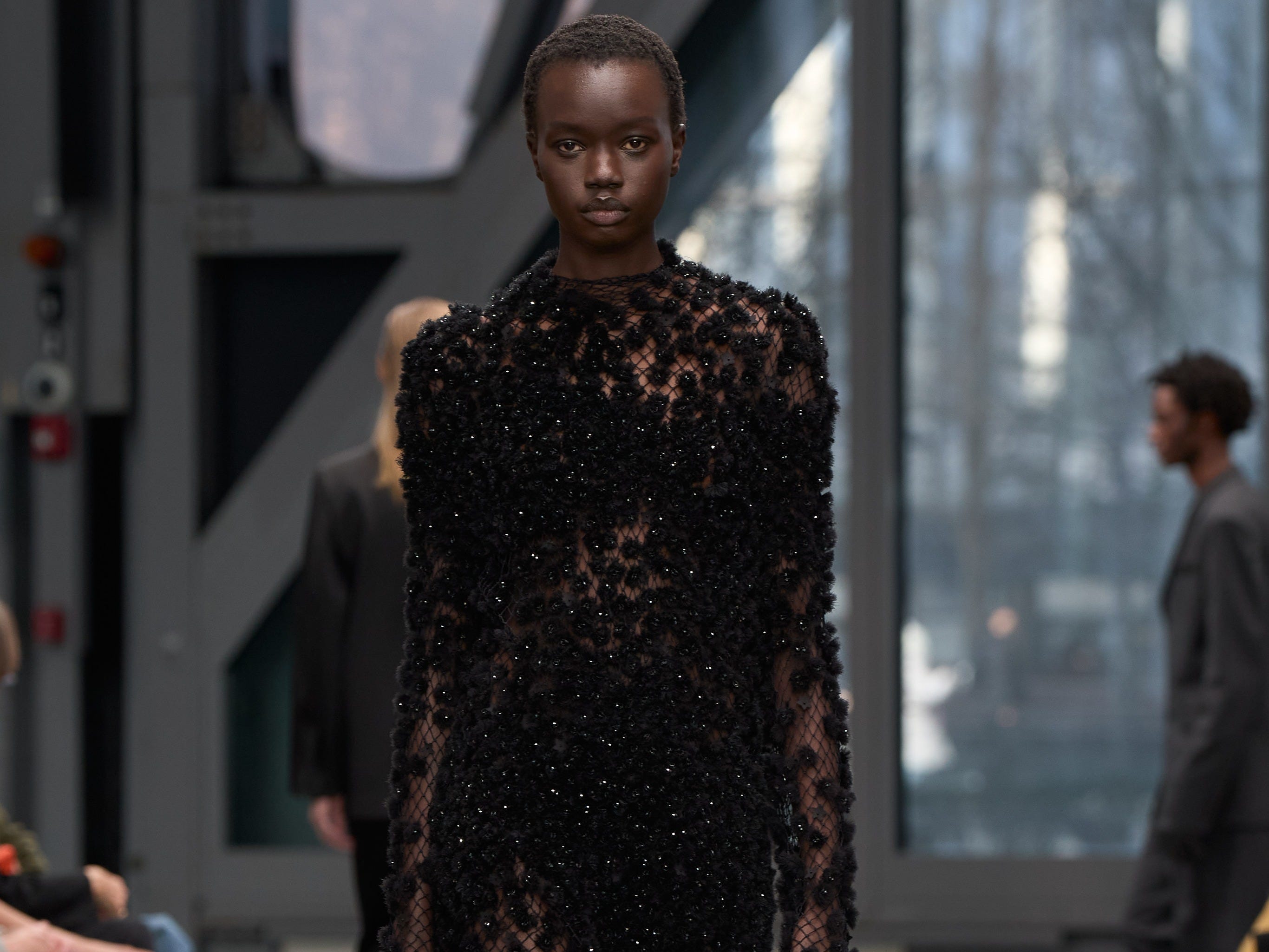 Em todos os estilos, a silhueta é alta e reta; a alfaiataria slim precisa com decotes inesperados nas costas e detalhes sem mangas cria tensão, enquanto vestidos intensamente trabalhados apresentam costas lisas contrastantes que revelam camadas internas. Golas brancas surgem enquanto golas biker adicionam um toque rústico, e golas de pelos sugerem grandiosidade antes de se expandirem em um casaco de pelos.