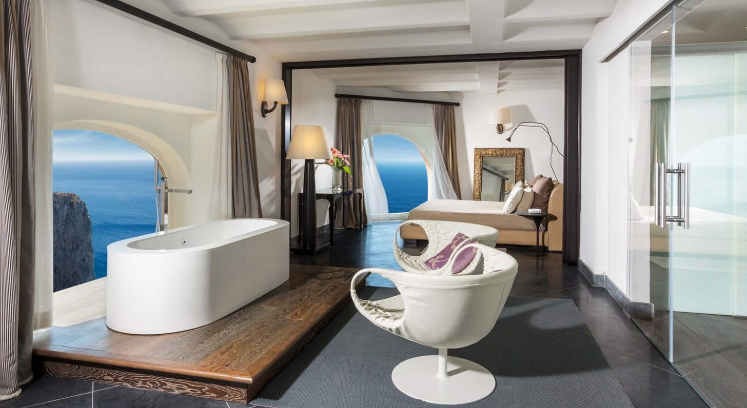 O hotel é composto por quartos e suítes espaçosas, cada um decorado com um estilo elegante e vistas panorâmicas. Os hóspedes podem desfrutar de uma praia privativa, acessada por um elevador esculpido na rocha, além de uma piscina de borda infinita com vistas deslumbrantes para o mar.