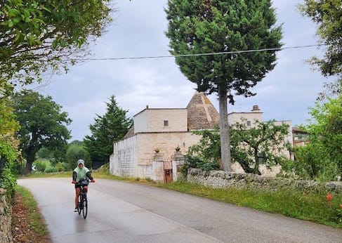 No percurso da semana, tivemos dias de pedal mais duro, onde cobríamos quase 60km no percurso do dia. No caminho, parávamos para visitar fazendas de mozarela e degustar o frescor de burratas feitas de modo artesanal, ou experimentar azeites tão vigorosos que sentíamos seu ardor na garganta. Almoços eram sempre acompanhados de um ou dois drinks, frutos do mar saborosos, e pratos típicos da região, além de muita conversa e risadas.