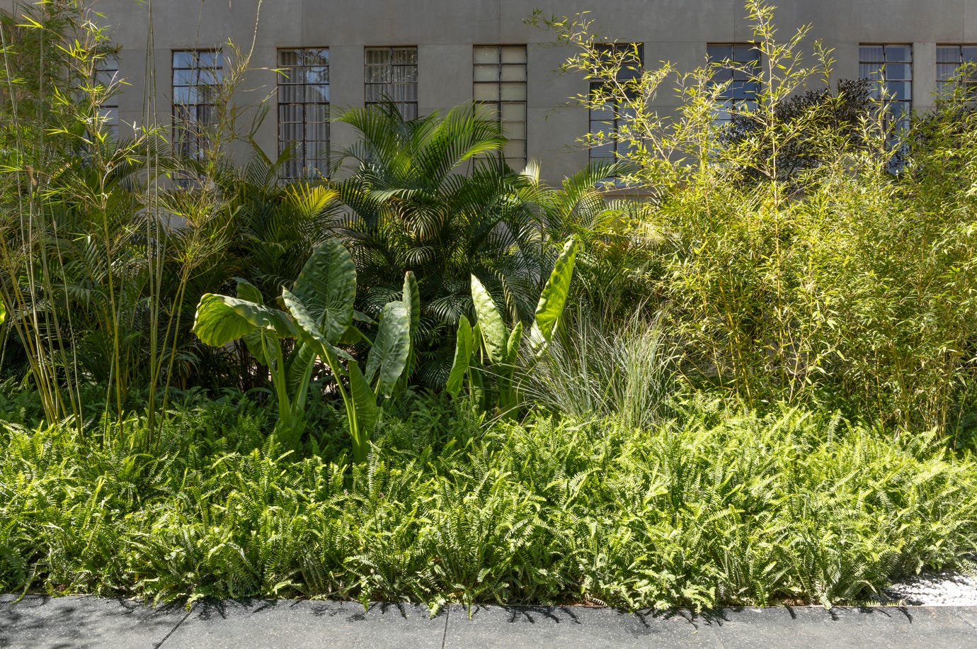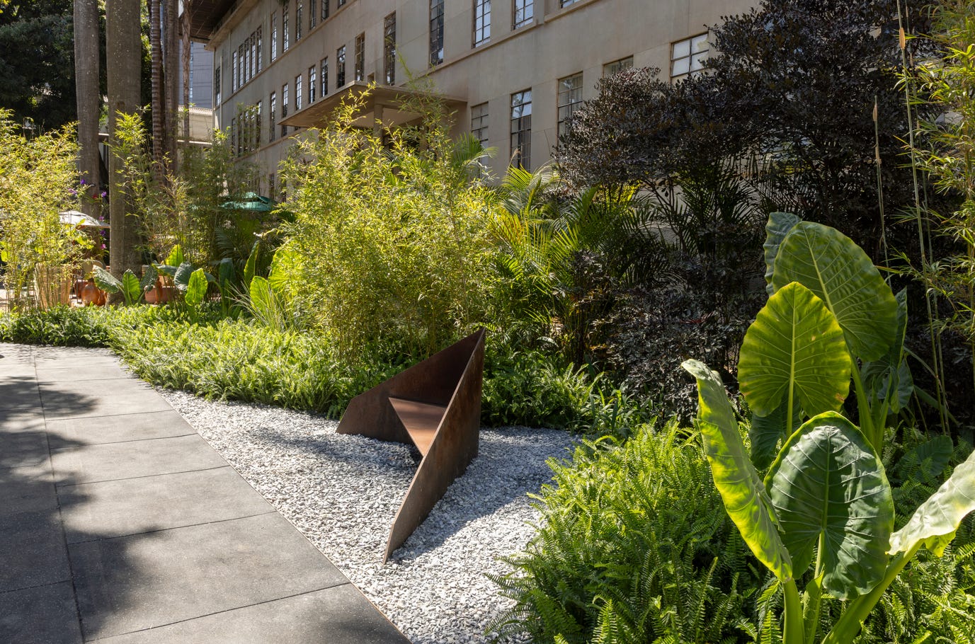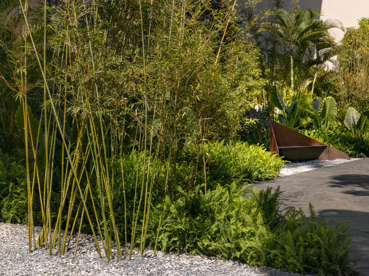 Bambus, capins, samambaias e folhagens compõem uma estética rica em texturas, formando um ambiente contemporâneo, leve e tropical.