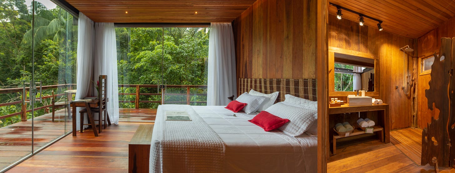 O hotel possui doze espaçosos bangalôs erguidos em madeira de lei que remetem à forma de barcos invertidos e design interior que incorpora materiais da floresta: revestimentos em teçume de fibras naturais, mobiliário de madeira nobre com detalhes em marchetaria, cestarias e outras belas peças de artesanato regional – muitos deles criados pelos profissionais da Fundação Almerinda Malaquias, ONG da qual o hotel é patrono e apoiador.
