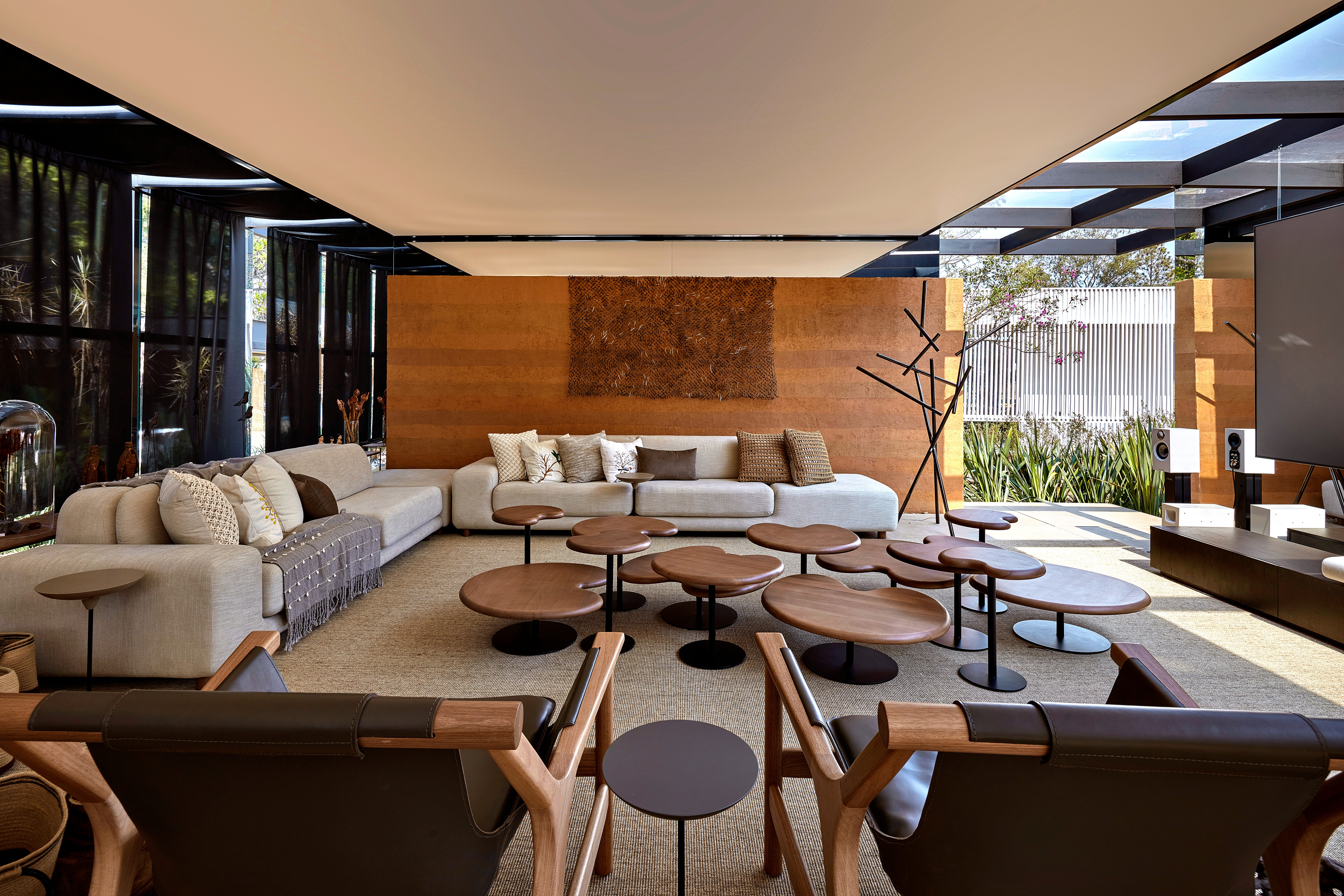 Com foco na sustentabilidade, as paredes estruturadas em alumínio não tocam o teto, trazendo leveza e troca de ar constante no espaço. Foram revestidas com a combinação de terra de diferentes pontos da capital mineira, resíduos de construção e óleo de linhaça, trabalho realizado por mulheres da bioconstrução.