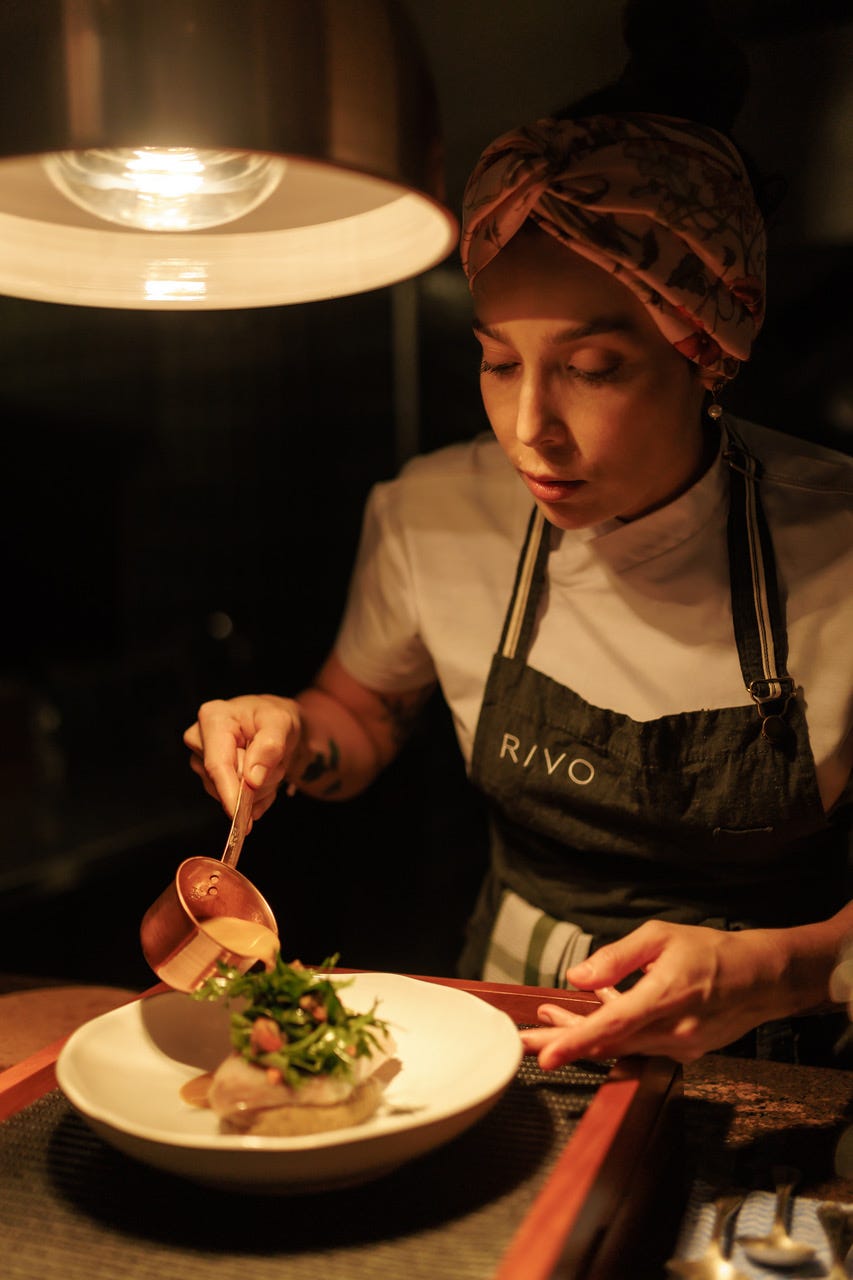 No Rivo, essa lógica se expressa em pratos onde o molho é parte estrutural da receita. No peixe do dia servido com purê de couve flor e mexilhão, a gremolata entra como contraponto fresco. De origem italiana, feita tradicionalmente com salsa, alho e raspas de limão, ela traz acidez e vivacidade ao prato, equilibrando a untuosidade do purê e o sabor marinho do mexilhão. A laranja e o coentro completam o conjunto, ampliando o frescor.