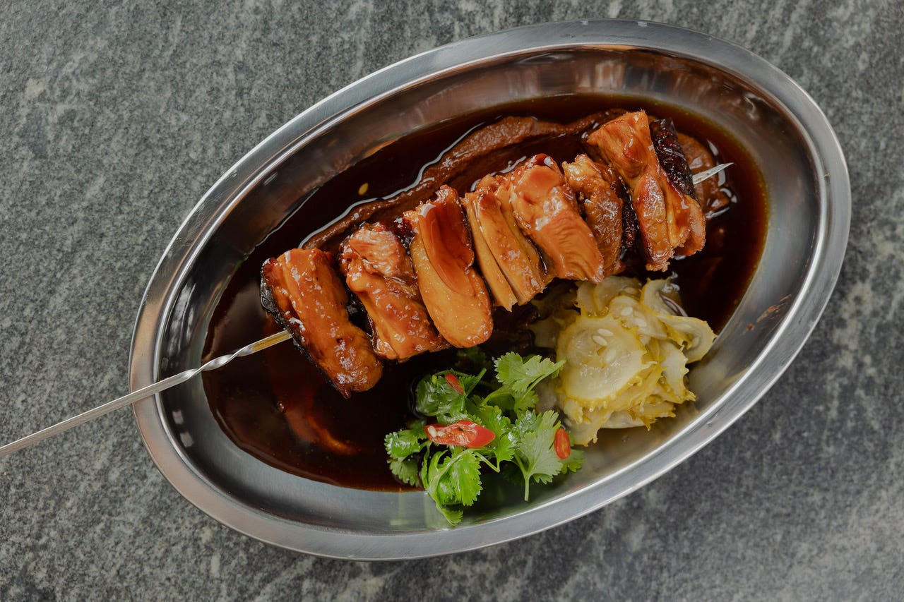 Na Casa Gabo, o molho é protagonista absoluto. O espeto de sobrecoxa ao mole negro traz o clássico molho mexicano como eixo do prato. O mole é um preparo complexo, construído a partir de pimentas secas, especiarias, sementes e cacau, resultado de tempo, técnica e tradição. Denso e intenso, ele envolve o frango grelhado no espeto, enquanto os picles de maxixe entram como contraponto de acidez e frescor, equilibrando sabores marcantes e criando tensão entre potência e leveza.