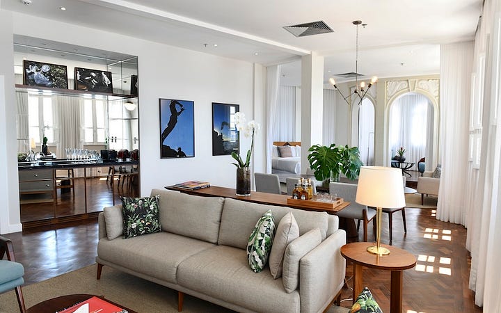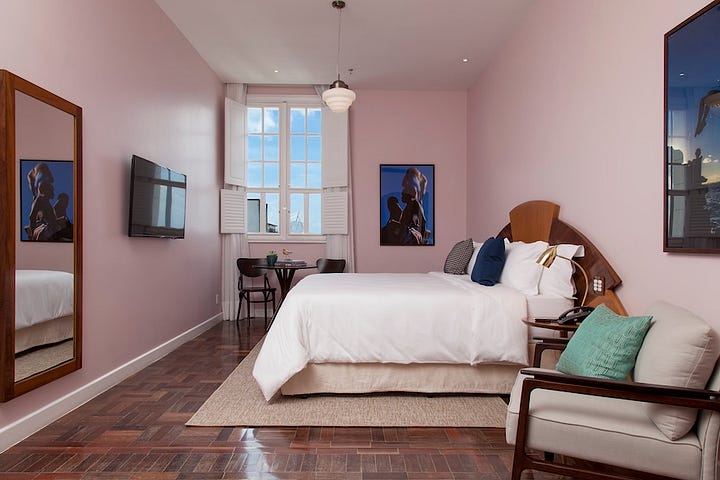 Os quartos contam com uma paleta de cores claras pastéis, que remetem ao Art Déco, e que também realçam a luminosidade da Bahia e ganharam móveis com forte identidade baiana através do uso de materiais regionais como linho nas cortinas, sisal nos tapetes e algodão para o enxoval.