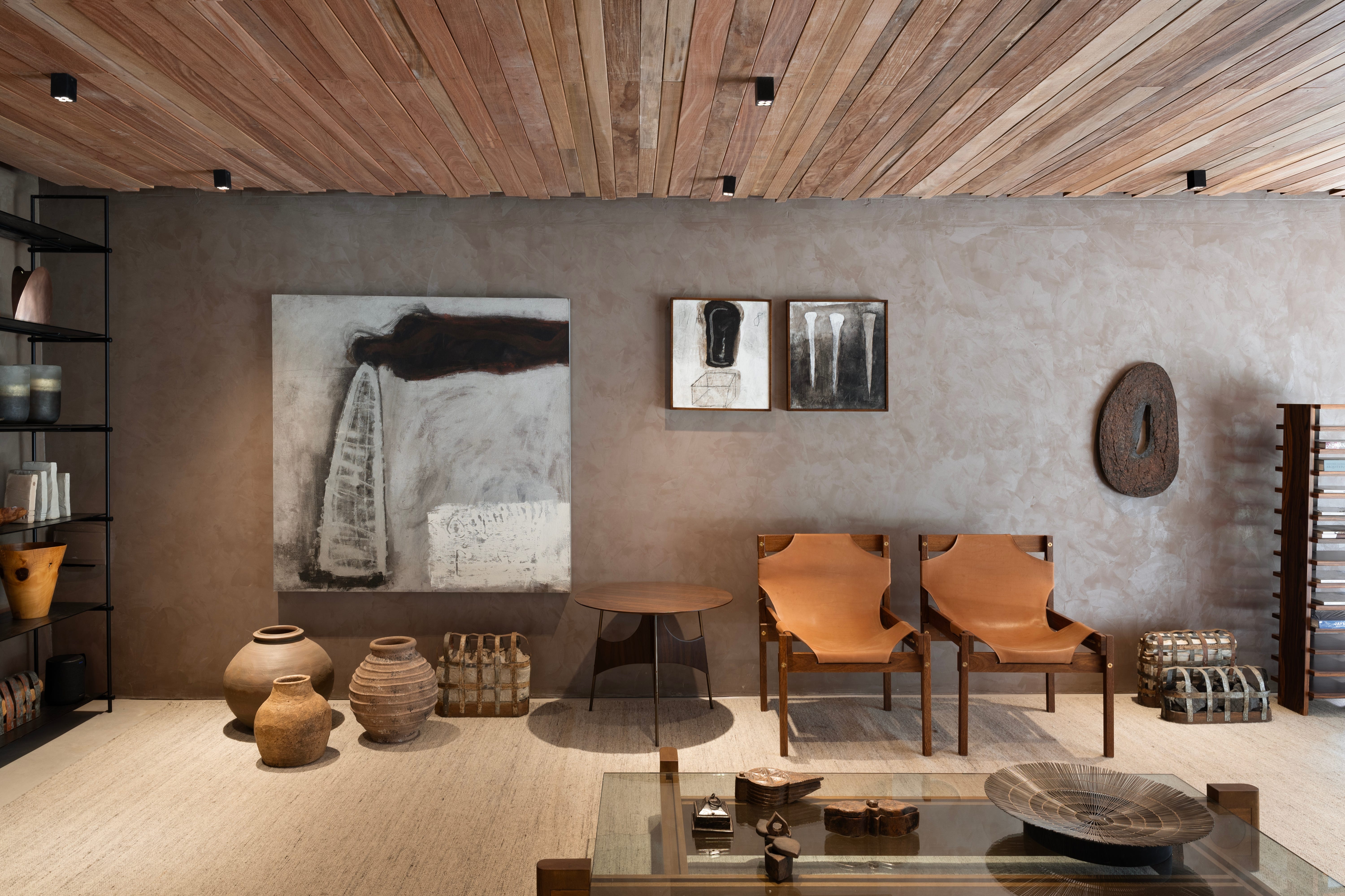 Nada é rígido, e há uma poética que permeia o espaço perceptível logo na entrada. Soma ainda o marrom como tom predominante para oferecer o almejado aconchego. O teto em madeira e a parede em espelho em sequência longitudinal criam uma ambiência intimista, onde o convívio com as peças expostas se torna natural, intuitivo, prazeroso.