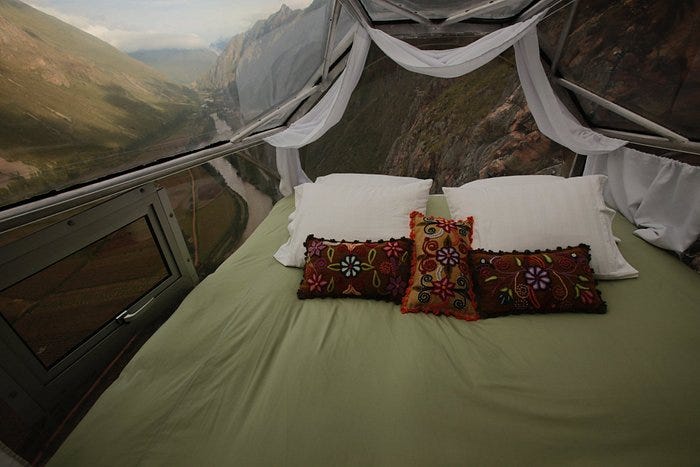Acordei com a luz do sol se chocando contra meus olhos, logo ao amanhecer. Quando olhei para trás, através das janelas do meu cubículo suspenso contra uma parede de pedra, pude ver parte do vale sagrado. As montanhas cobertas de neve decoravam o fundo do horizonte, como aquele papel de parede detalhado que embeleza as telas dos nossos computadores— assim começou meu dia no hotel Skylodge Adventure Suites.