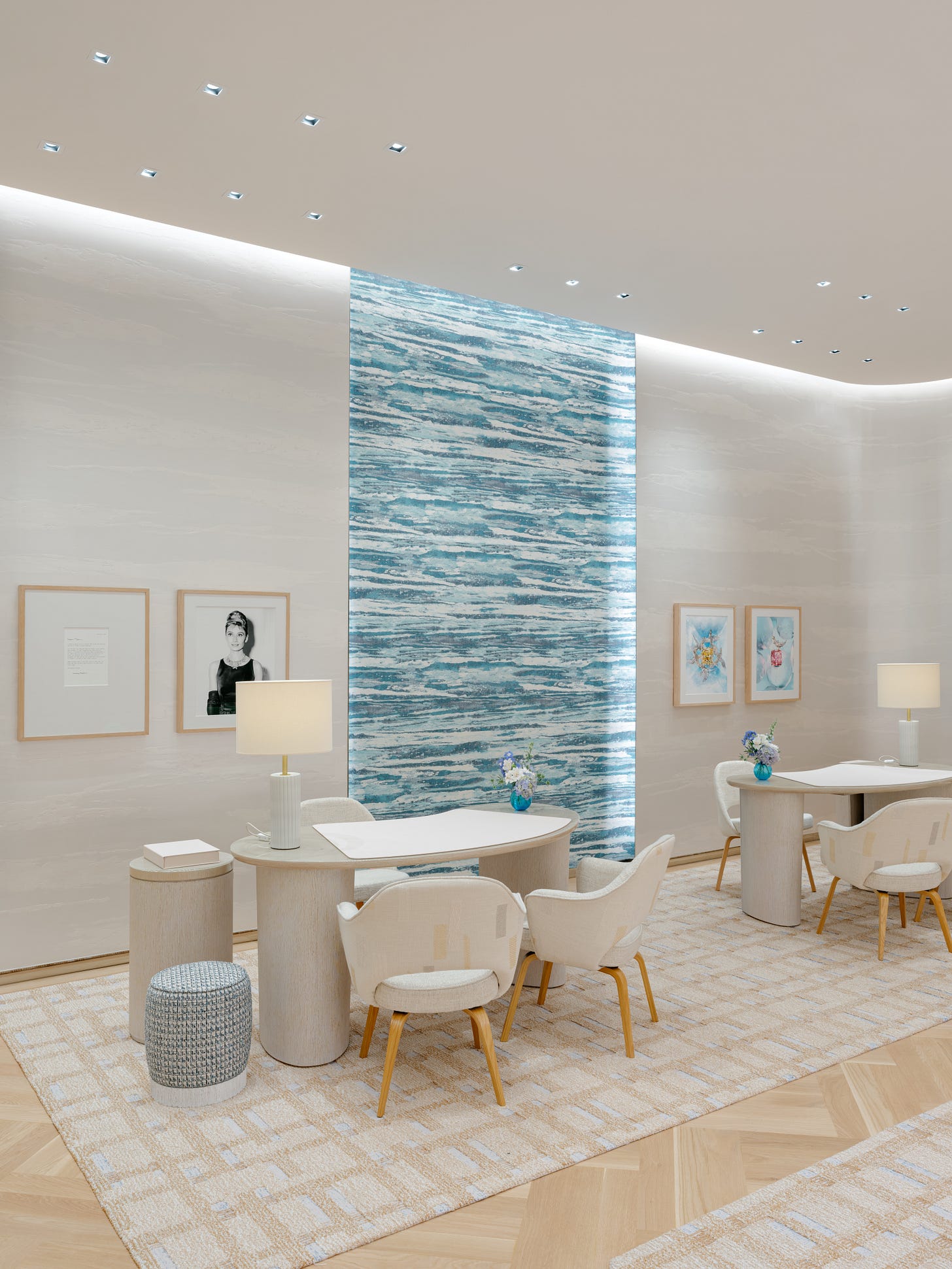 Em homenagem ao legado de Louis Comfort Tiffany e ao seu trabalho em mosaicos do início do século XX, a fachada da loja apresenta um caleidoscópio de mosaicos em diversos tons de azul. As peças são de cerâmicas feitas à mão, valorizando a arte e o trabalho artesanal da marca. O design traz uma textura única e uma elegância atemporal, imergindo imediatamente os visitantes no encanto da Tiffany & Co.