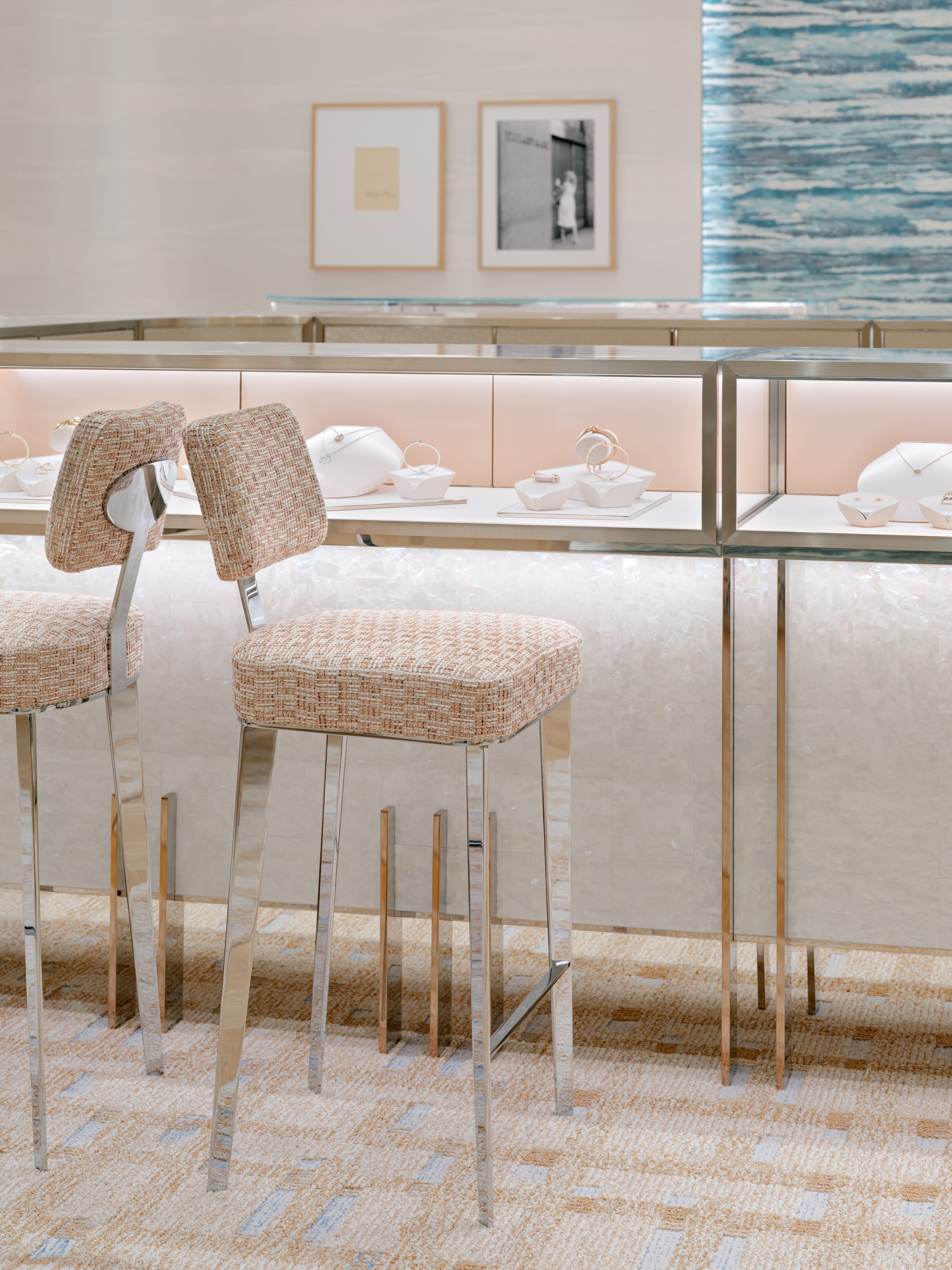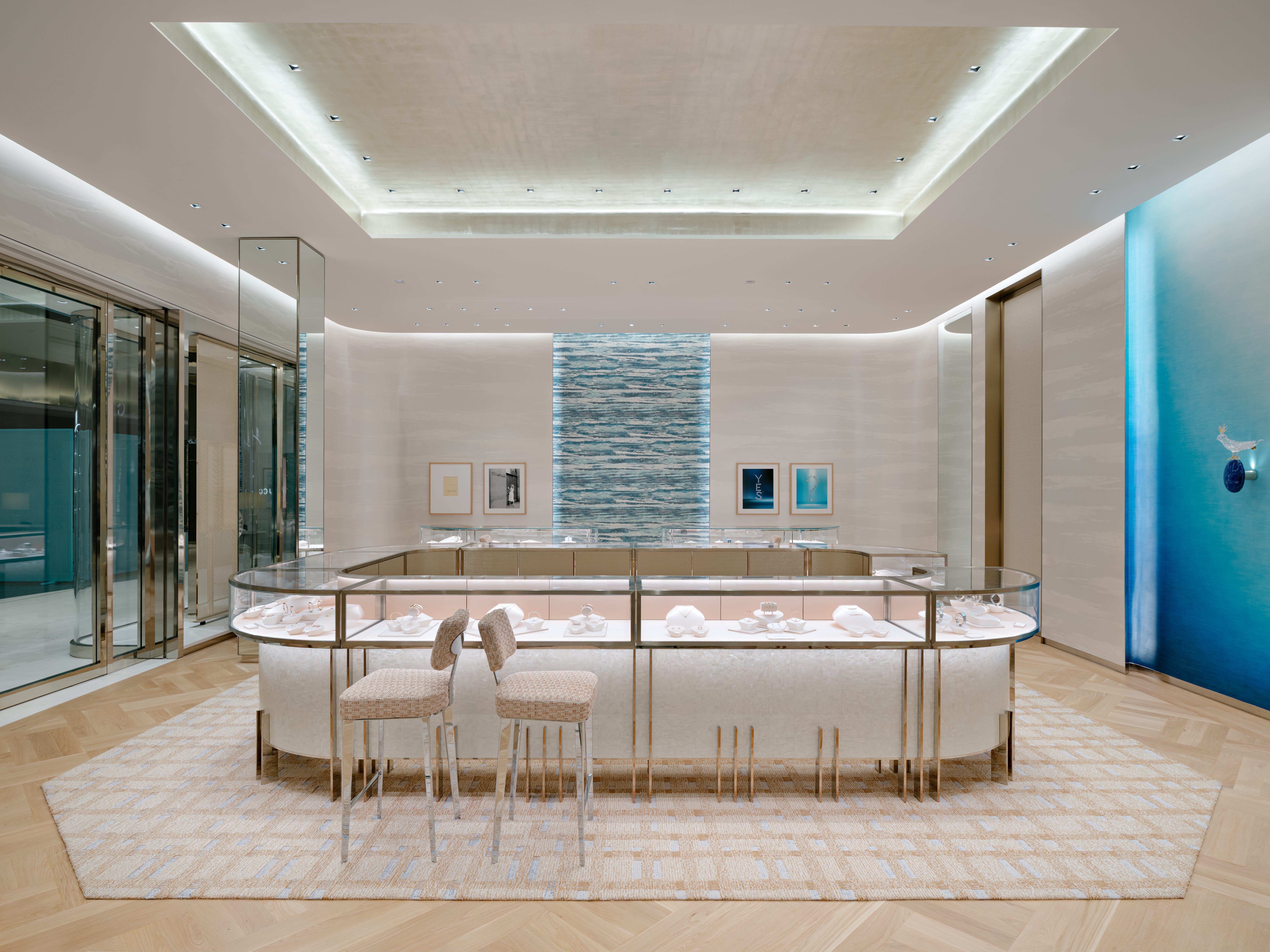 Com 100m², a loja incorpora a excelência criativa e a inventividade da Tiffany & Co., ao mesmo tempo em que celebra o seu legado. Ao entrar na loja, os visitantes são atraídos por uma impressionante parede com pintura à mão da obra Bird on a Rock.