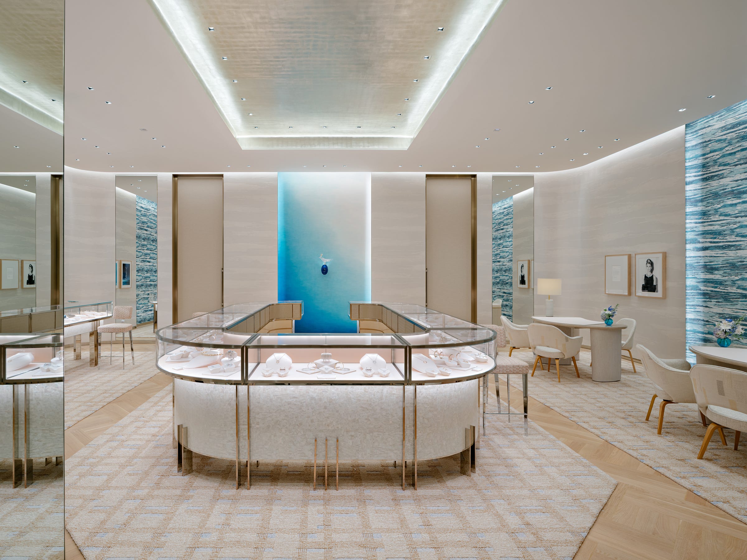 Introduzida em 1965, o Bird on a Rock é tão moderno e relevante hoje quanto era há quase 60 anos, quando Jean Schlumberger criou essa icônica peça. Os interiores são decorados com uma paleta de cores suaves e detalhes em dourado champanhe. Paredes artesanais com reboco texturizado e painéis estofados criam um cenário de luxo e sofisticação.