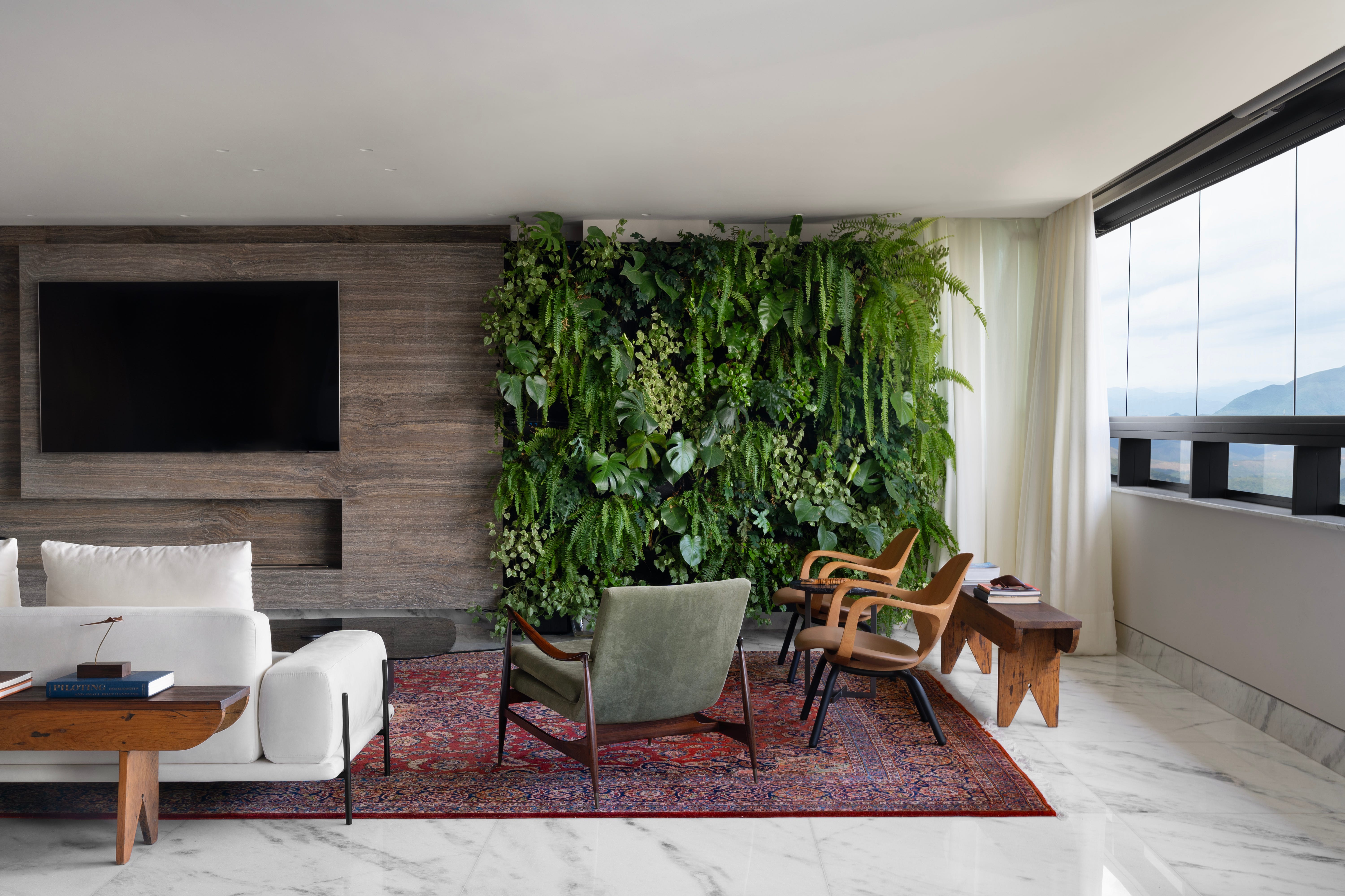 Uma história que começa com uma vista deslumbrante. Para ser desfrutada de vários ângulos nesse apartamento, ela foi o ponto de partida do projeto. Os ambientes integrados e a presença do verde mimetizado à paisagem são elementos que criam uma conversa com a amplidão do lado de fora também internamente.