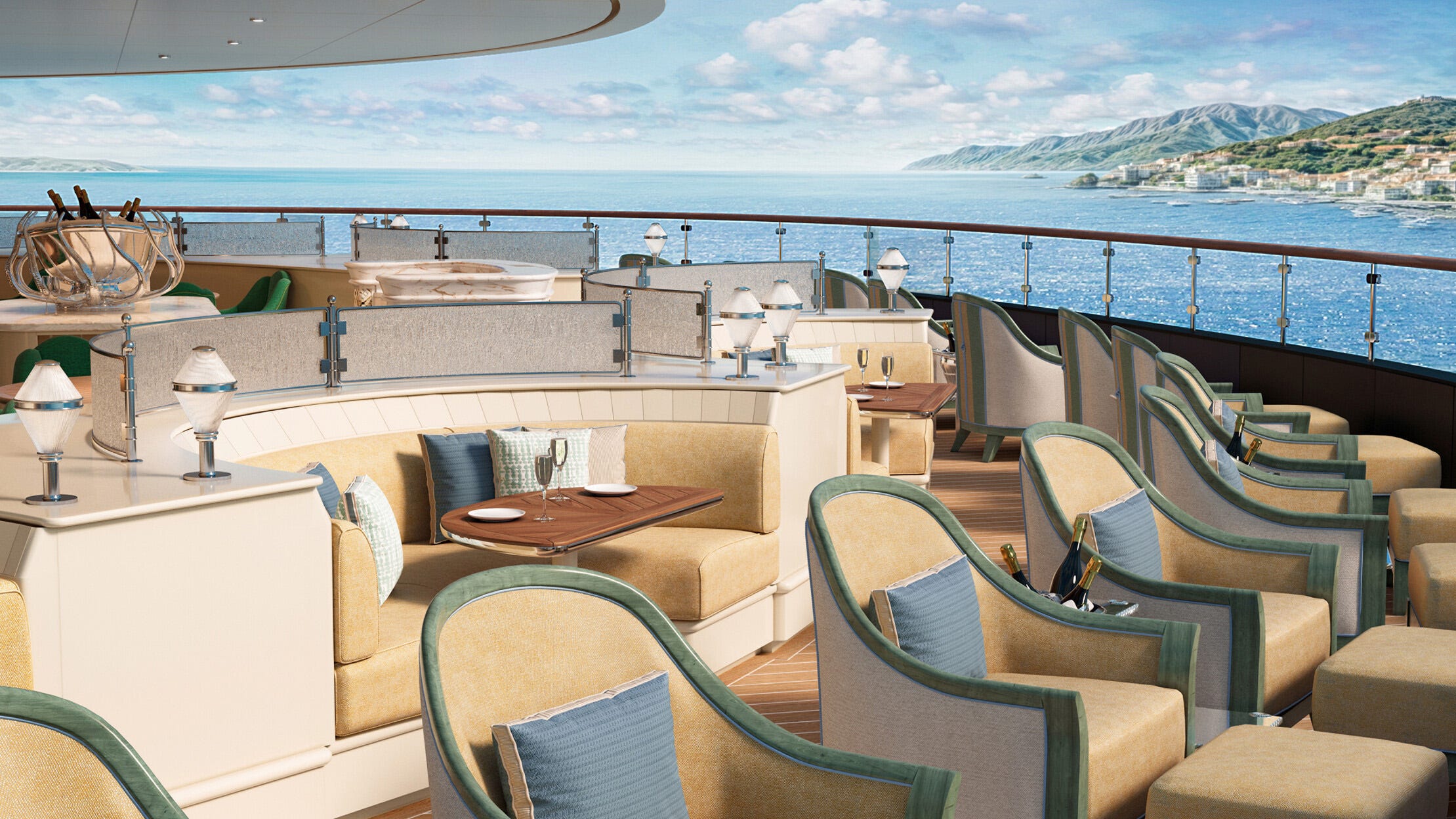 Nos dias em que o iate ancorar em águas tranquilas, o Marina Bar é ponto de partida para as atividades aquáticas e tem serviço completo com espreguiçadeiras e petiscos leves. À noite, o espaço se transforma no cenário para observar estrelas, com coquetéis e serviço completo para celebrações ao nível do mar.