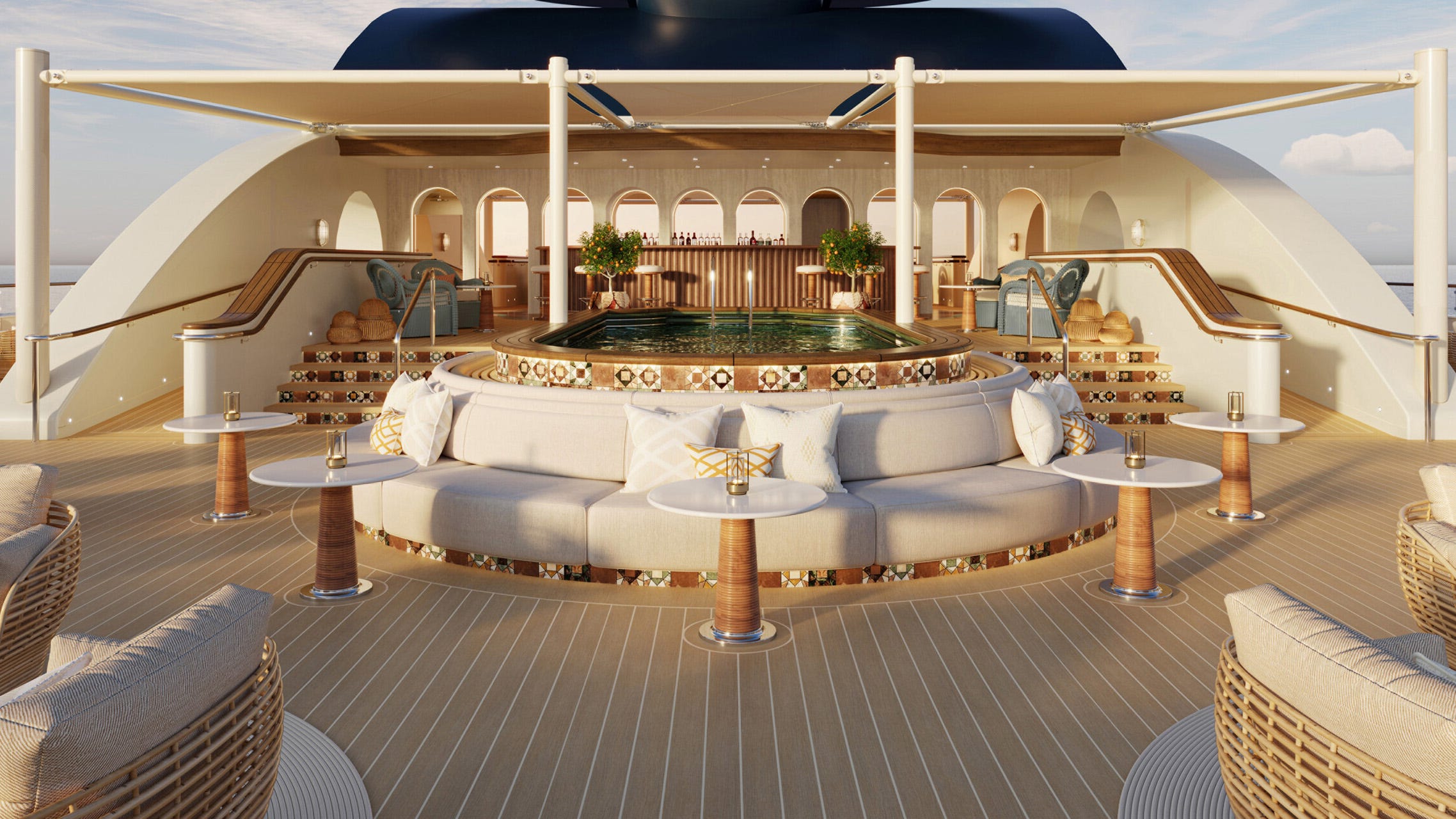 Entre os atributos do iate está a icônica “Funnel Suite”, com 927 m² e seus módulos de vidro curvo do chão ao teto, compostos pela maior peça de vidro contínua no mar; além de uma marina transversal que foi desenhada exclusivamente para o Four Seasons Yacht, com aberturas expansivas de um lado a outro da embarcação, de bombordo a estibordo.