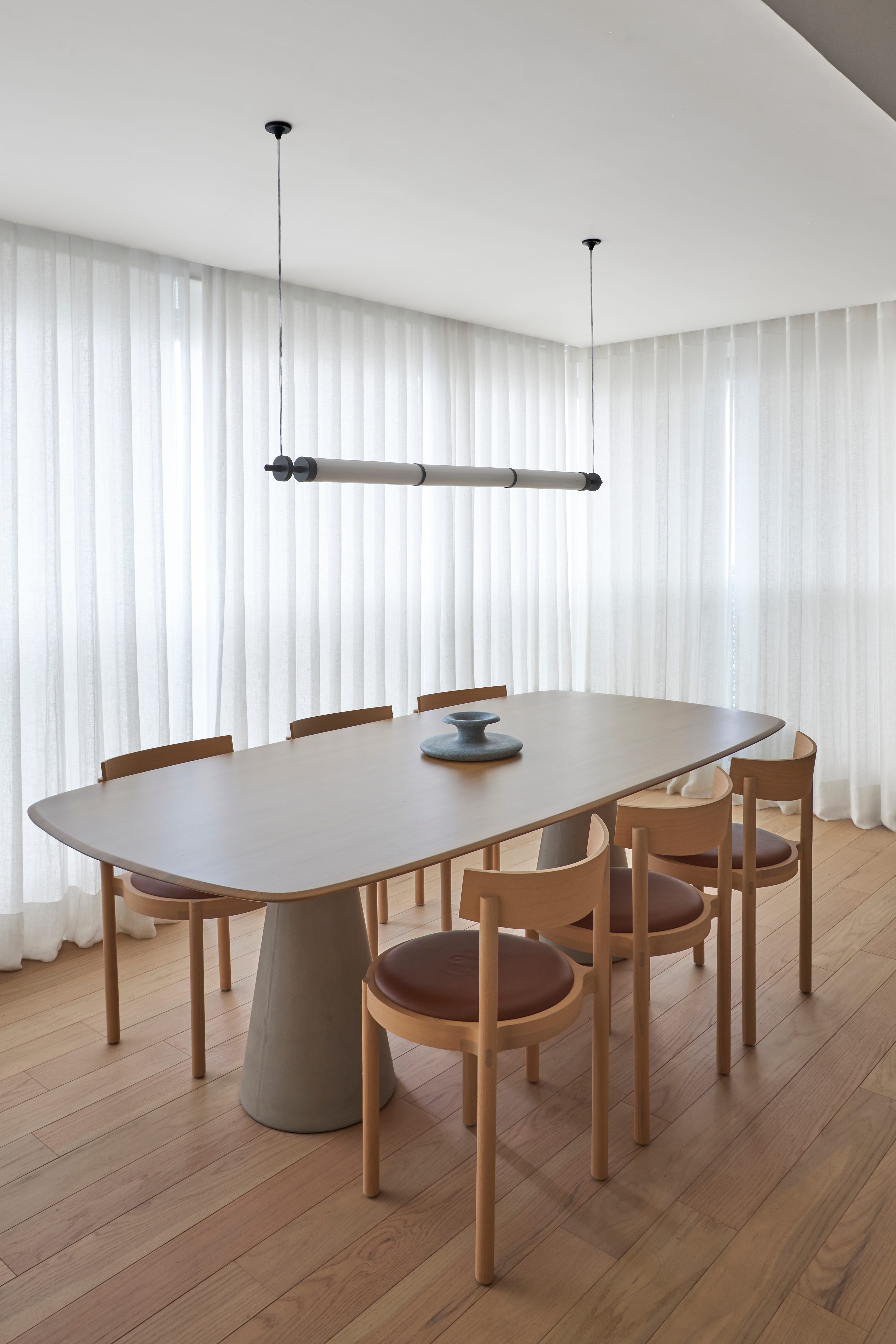 Para ganhar espaço, a varanda foi incorporada, transformando-se em sala de jantar. O teto descascado, o uso de materiais naturais e a leveza criam uma sofisticação, em termos de concepção e design, que se traduz em uma linha de pensamento harmônica.